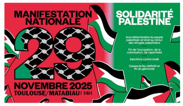 24 novembre 2025Dans le cadre de la manifestation nationale du 29 novembre, Couserans-Palestine appelle à rejoindre nombreuses et nombreux la manifestation qui aura lieu à Toulouse à partir de 14h. Départ devant la gare Matabiau