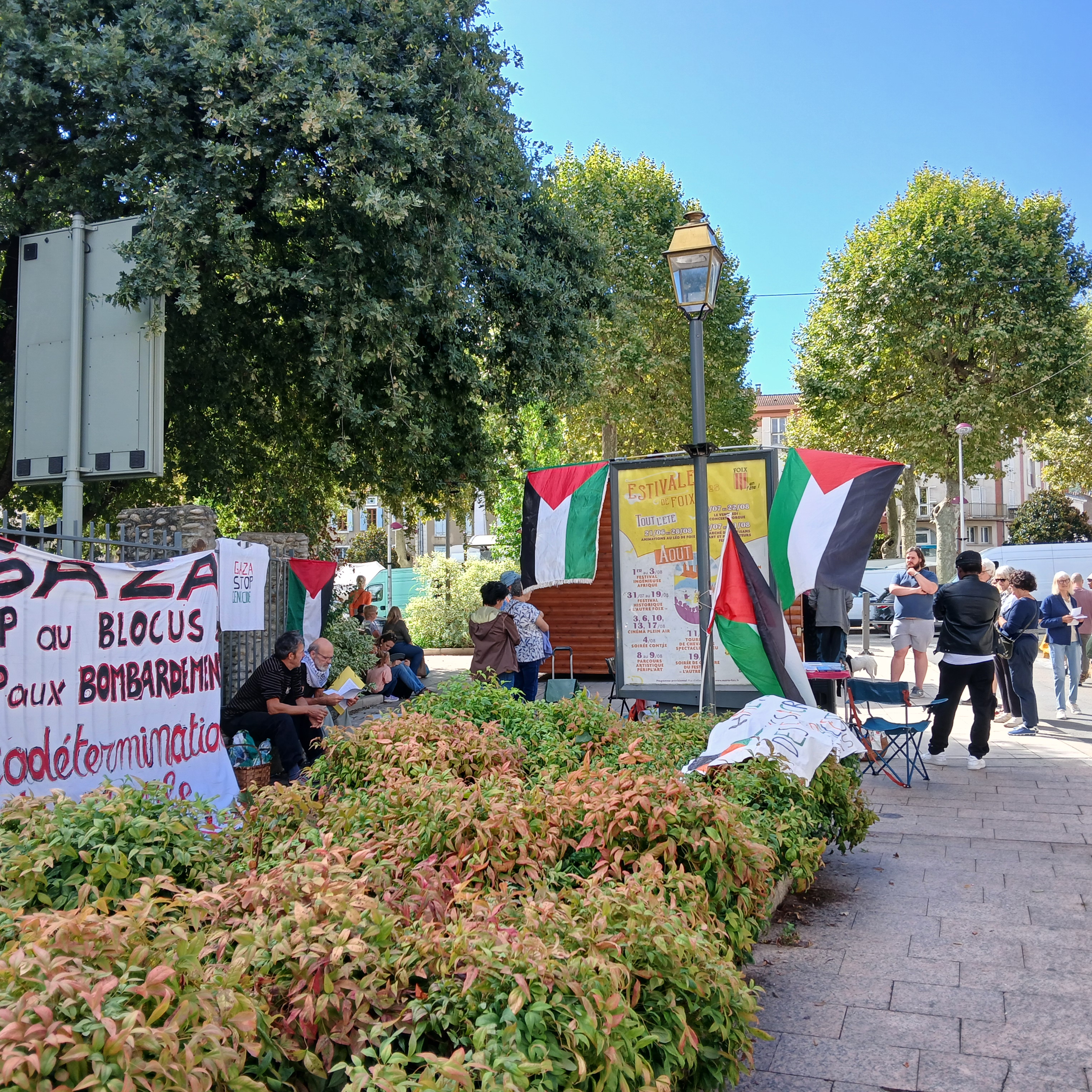 GAZA Cessez-le-feu immédiat, entrée massive d’aide humanitaire dans la bande de Gaza, application du droit international ! Vendredi 29 aout. Un rassemblement s’est tenu de 8h à 15h devant la Halle Villote à Foix