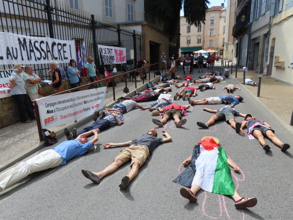 5 juillet 2025Un moment fort de cette mobilisation à été le "die in" pendant lequel les manifestant.es se sont allongé.es sur la chaussée pour symboliser et rappeler le génocide à Gaza. (Voir photo)