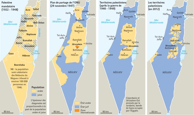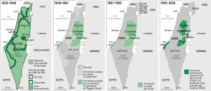 Ci-dessous, la carte du Monde Diplomatique sur la réduction des territoires palestiniens au profit d’Israël.