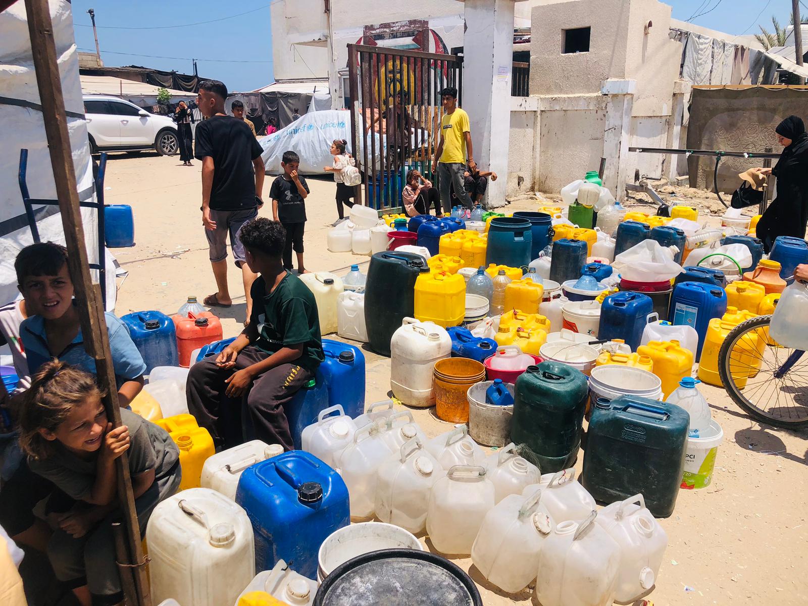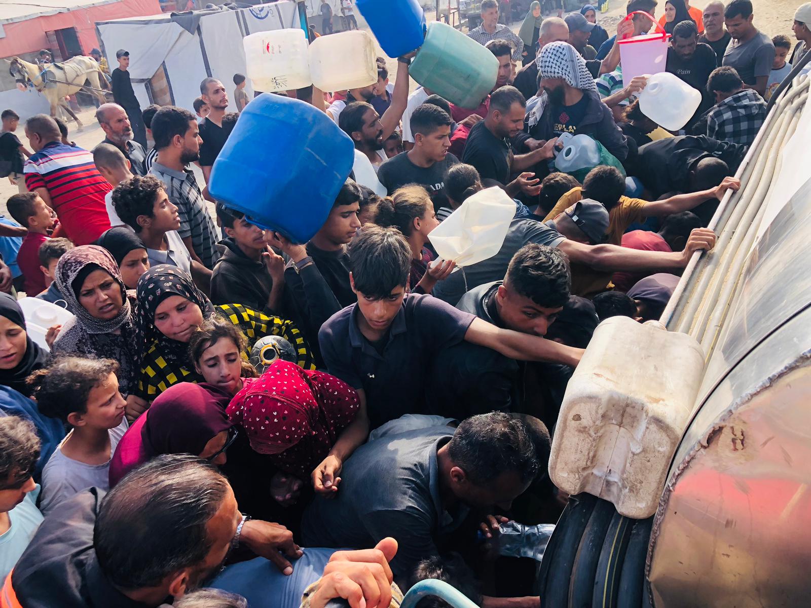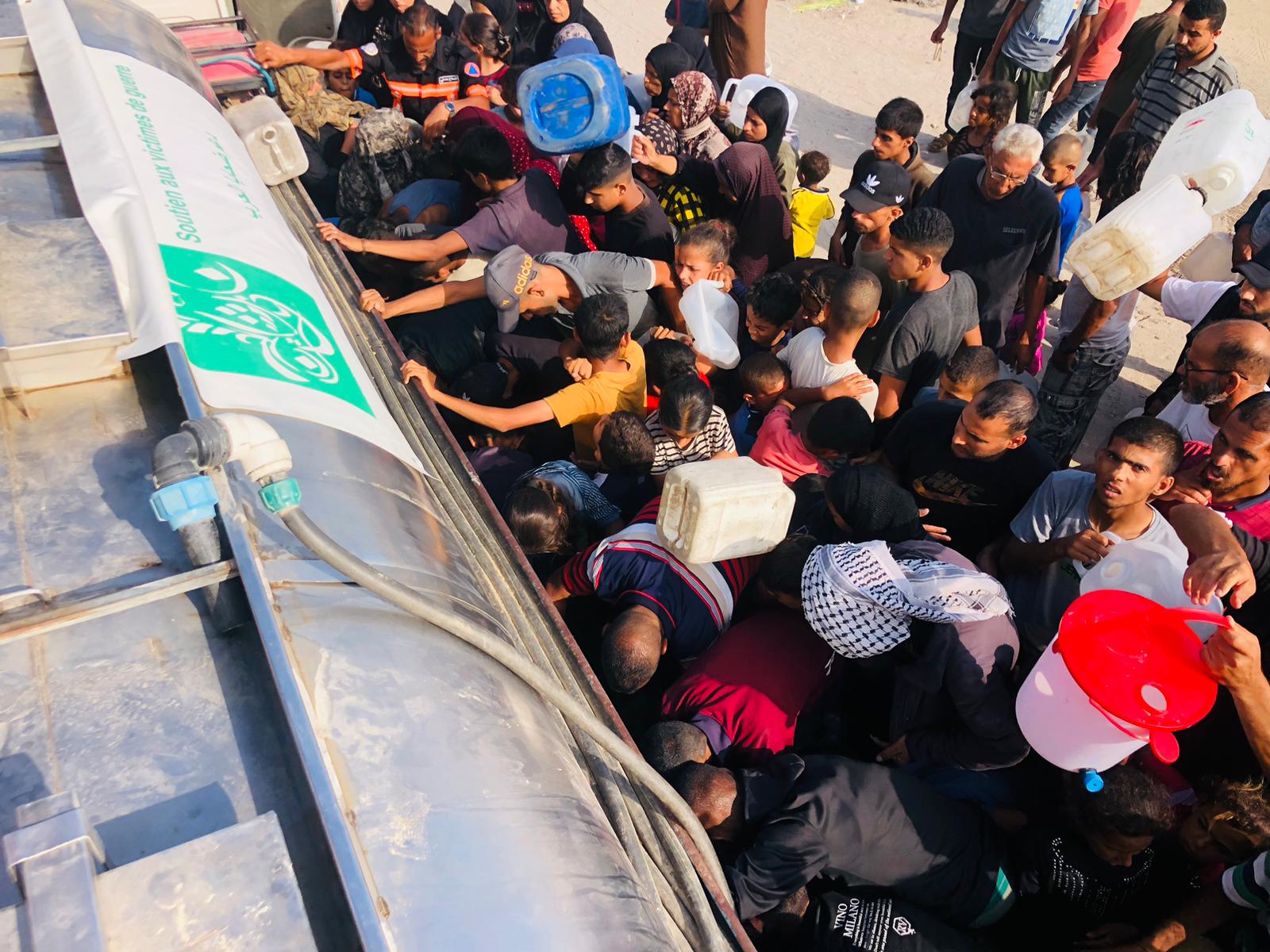 Hatem EL Ta’i ’’ à côté de l’hopital Nasser , le nombre de bénéficiaire est près de 250 Famille, environ 1100 personnes. J’ai entendu beaucoup d’histoire au moment de distribution, Malheureusement, beaucoup retournent à leurs tentes sans avoir pu obtenir d’eau car le réservoir est à sec. J’ai une équipe qui a essayé d’organiser la distribution, mais le besoin des gens en eau, qui est essentiel à leurs nécessités et leur droit à la vie, a surpassé tout et a brisé toute tentative d’organisation.